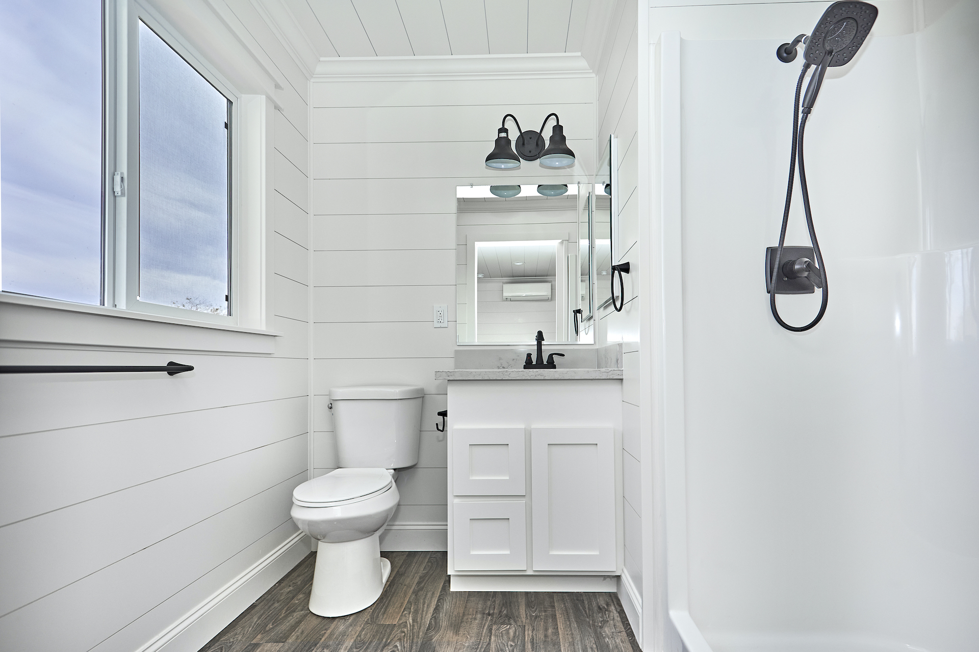 Just past the kitchen you’ll find a spacious bathroom with a large stand up shower. On the opposite side of the house, the large flex space can be used as a main floor bedroom and living room or office.