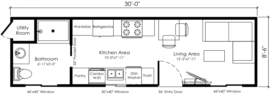The Thirty Foot Model is a 30′ tiny house on wheels that has been pre-engineered and designed by Back Porch Homes to be permitted as an alternative dwelling unit (ADU) in California and beyond. It’s the little sister to the Forty Foot Model.
