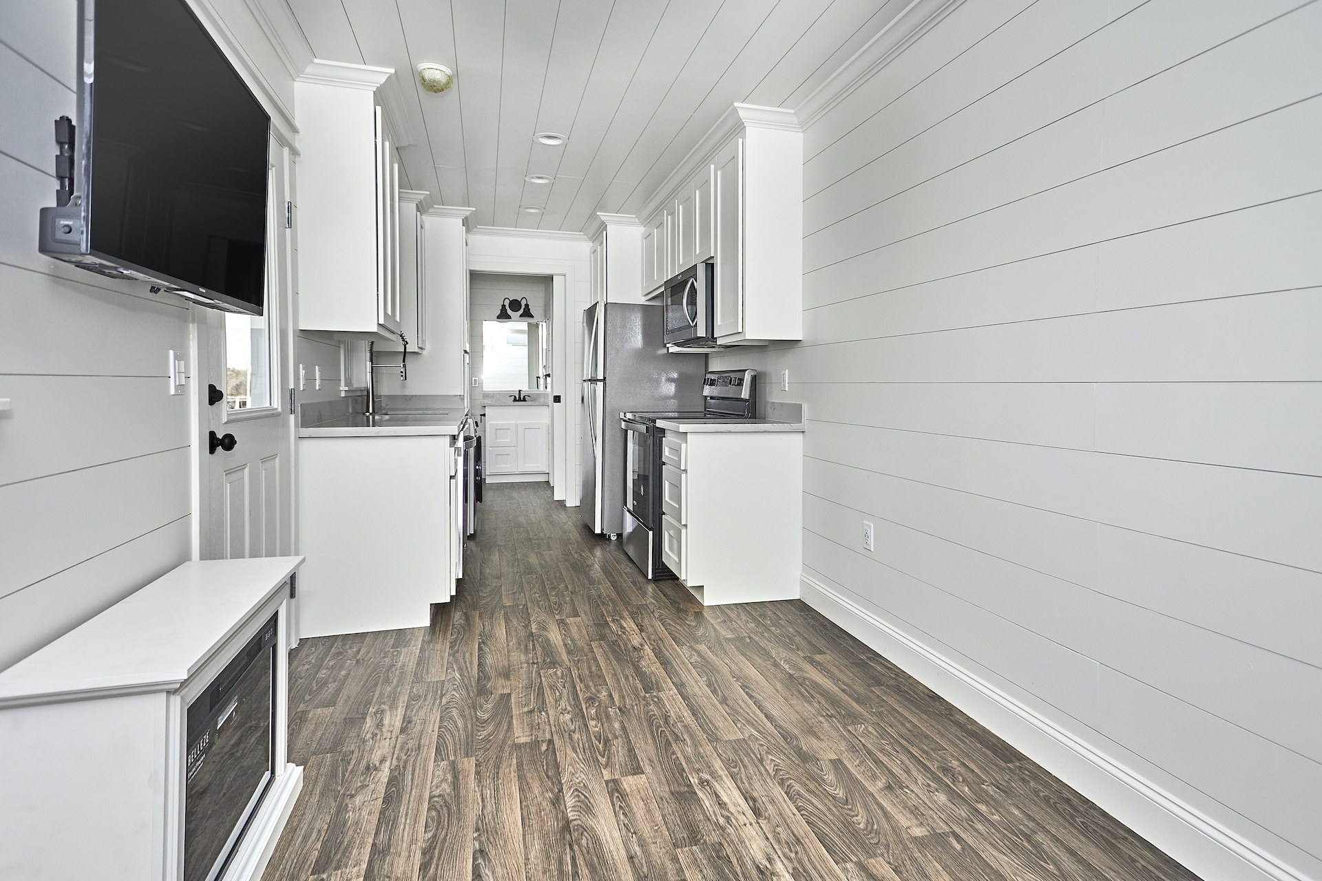 On the front end of the tiny house is the dedicated master on the main bedroom with a built in closet. Spacious and accommodating this is an excellent built in feature that allows those that don’t want a second story bedroom to still live in a tiny house.