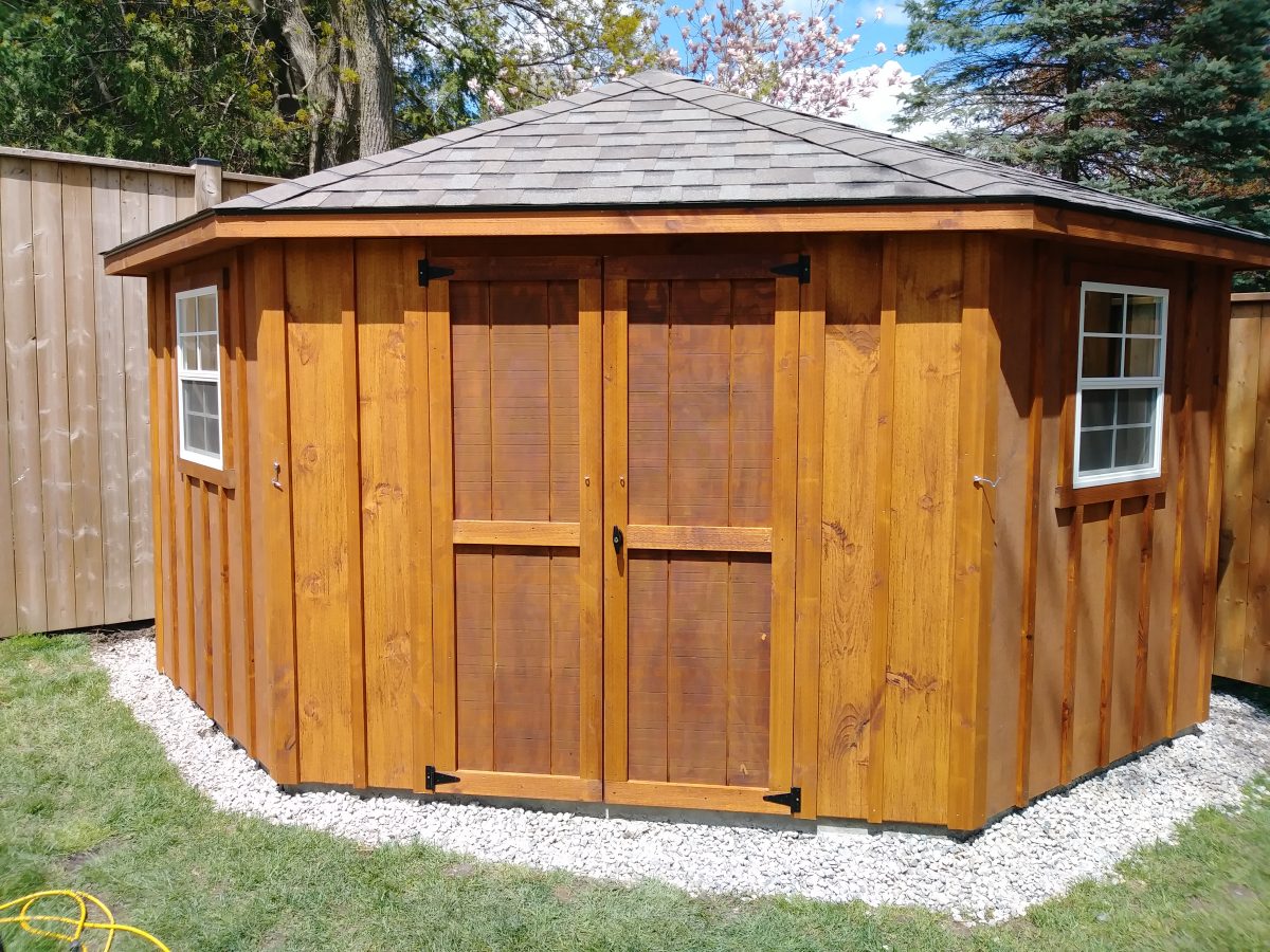 5 sided sheds are designed to fit into the corner of your yard. 30″ minimum space is suggested between the shed and the property line for bylaw restrictions as well as maintenance and painting. Available in LP Smartside (primed engineered plywood) or pine board and batten siding. Your choice of black, brown or driftwood colour shingles
