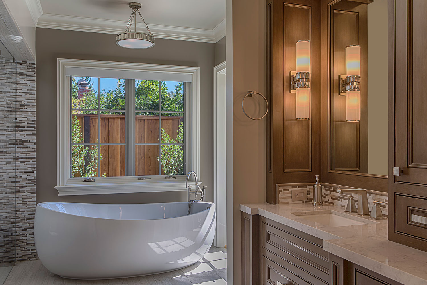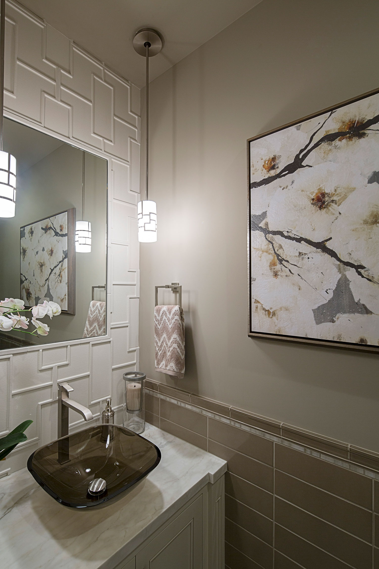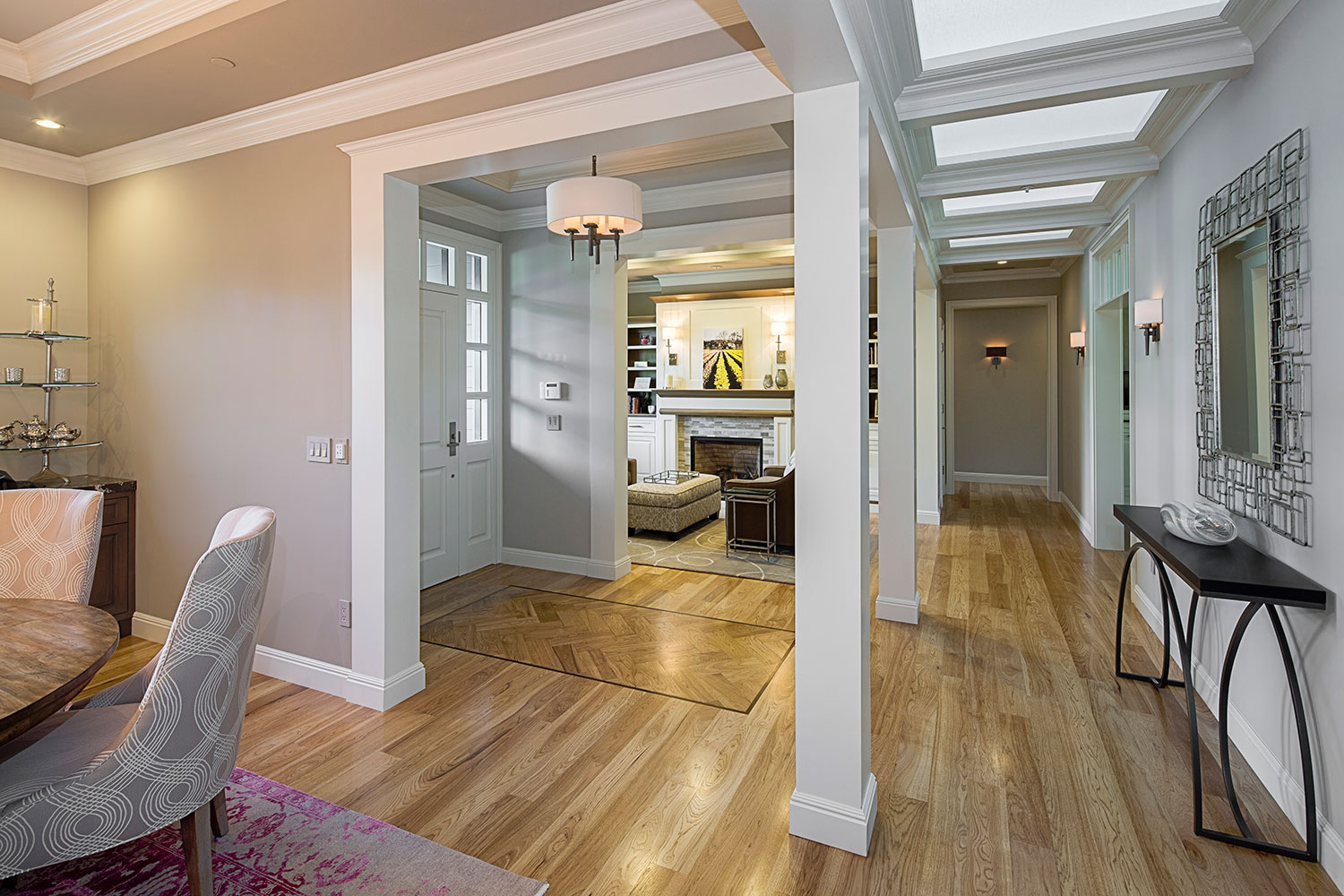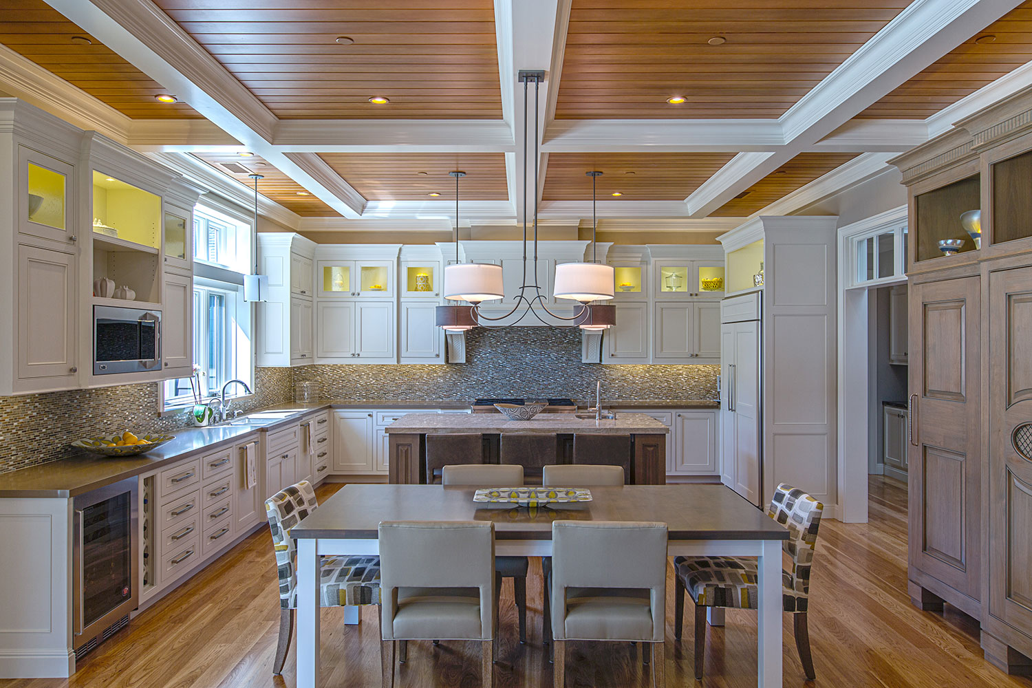 Elegant kitchen with boxed beam ceiling and spacious dining area, is created for joyous gatherings. Guests are treated to a tile wall with full height mirror in the jewel box powder room
