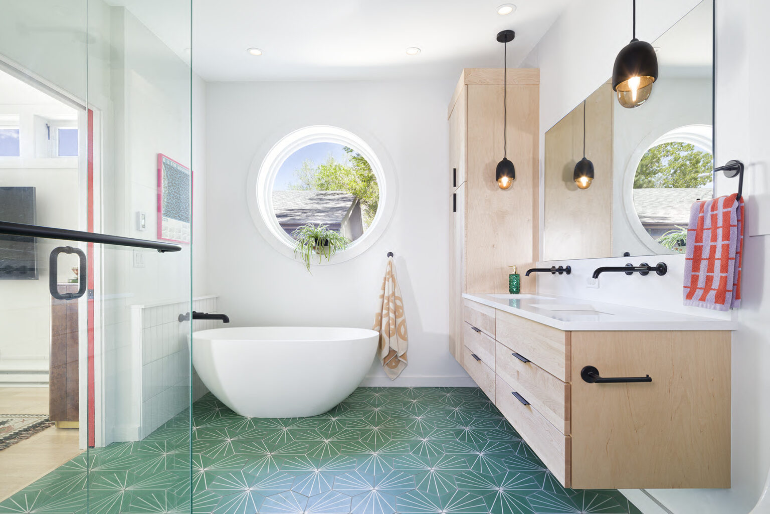 This project’s most exciting design elements are the pops of color that give this space life and personality. Designers incorporated turquoise hexagon tile throughout the entire bathroom. The seamless way the flooring acts as a base for the whole bathroom, including the shower flooring, is an attractive design choice that makes for a clean and simple aesthetic. Simple, floating cabinets and bathroom vanity are a modern touch that provides plenty of storage and extenuate the bold tile below.