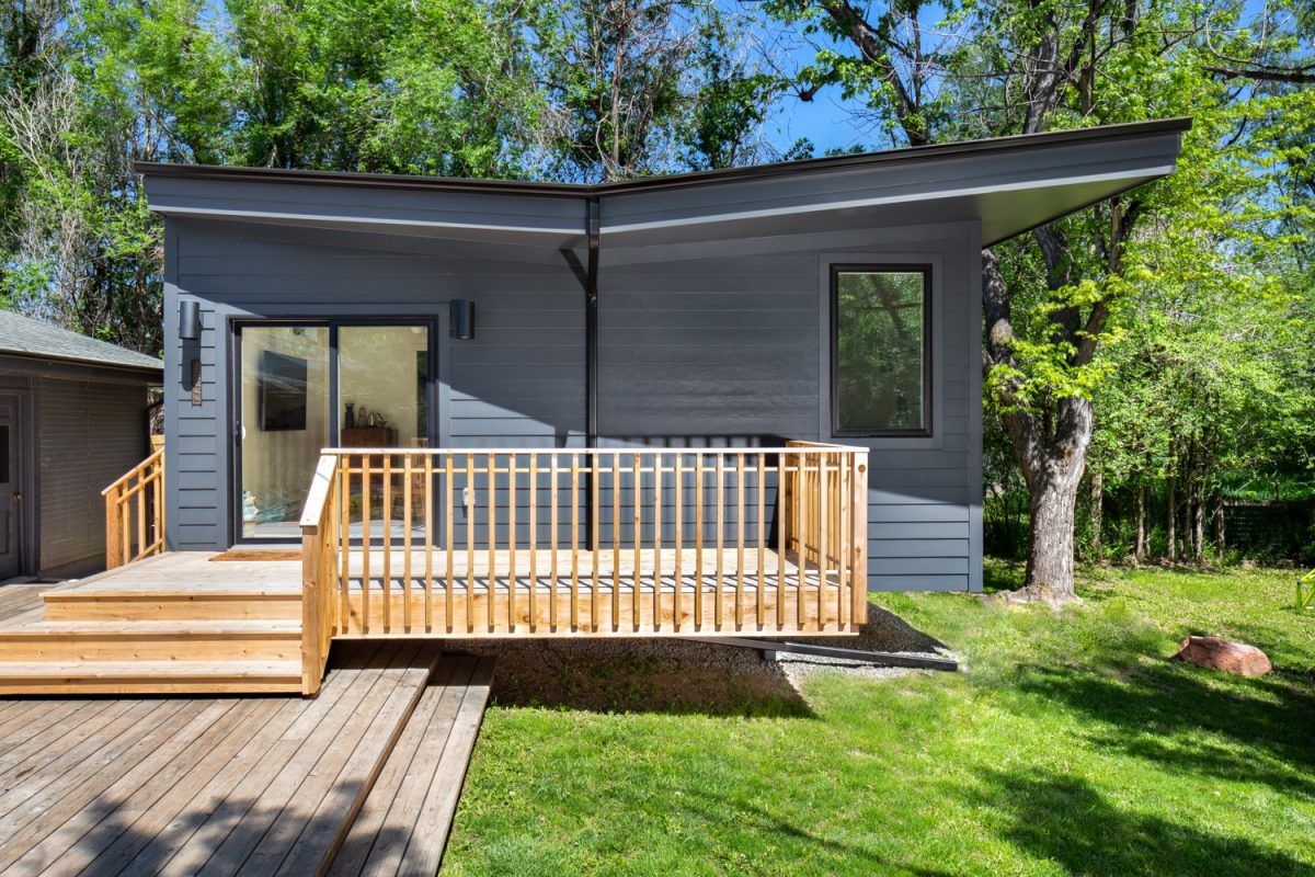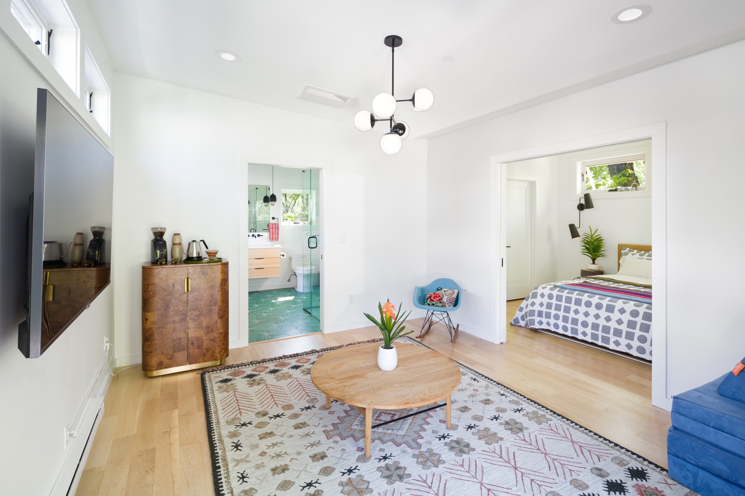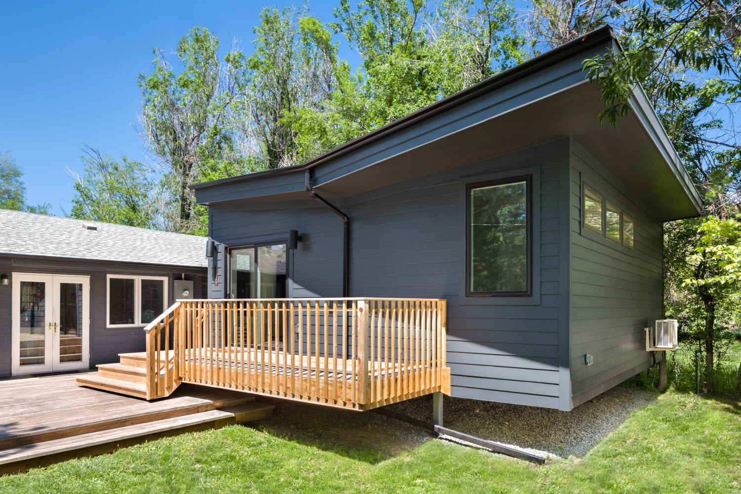 This accessory dwelling unit perfectly demonstrates a way to expand a home’s square footage creatively; in this case, our clients created a guest house including a bedroom, living area, and full bathroom with artsy Boulder flare. Having an ADU that includes a bedroom and living room gives these clients extra space to host guests or create a flex space such as a home office or art studio.