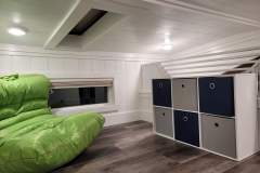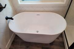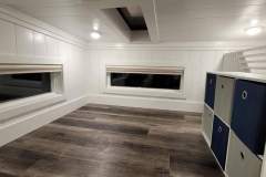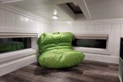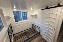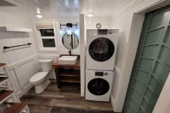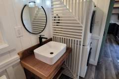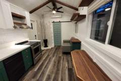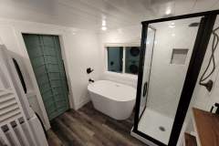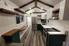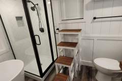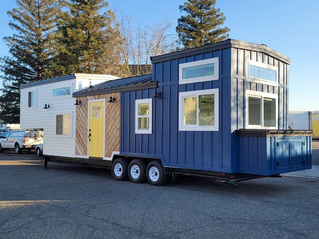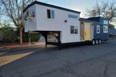 This not so tiny house comes in at 400 square feet! It is 40′ long, 10′ wide and a gooseneck style. It boasts 3 bedrooms. That’s right, THREE. The two level master is spacious and the two other bedrooms are in the rear, one on the main floor and the other a loft. This model has a large kitchen area, providing everything one would need for home cooked meals. We must say, though, the bathroom is the focal point of this tiny house