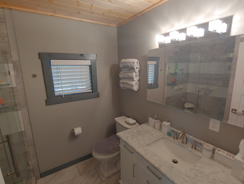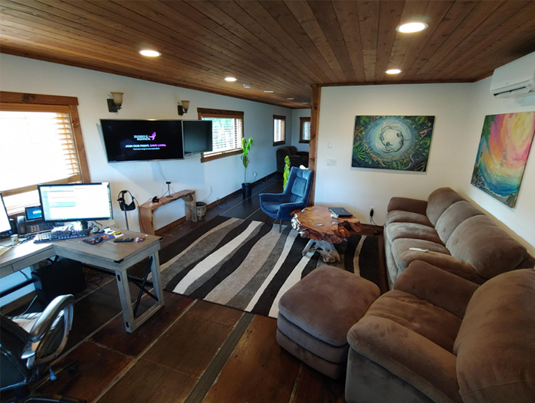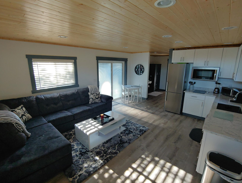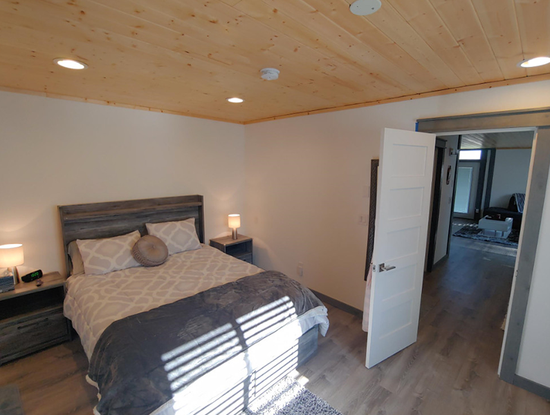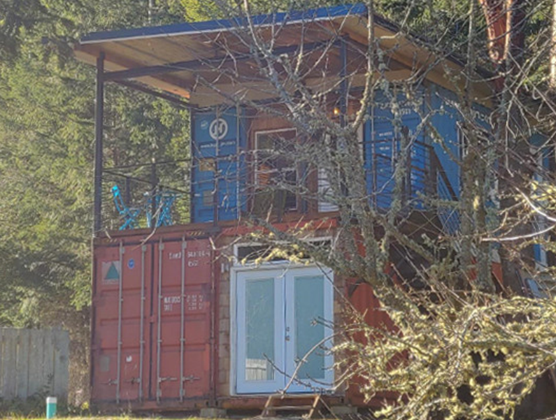 The Prospect series are double-wide two story homes. This 1280sf home has a ten foot cantilever and a ten foot deck. Two bedrooms, two baths, multiple home office spaces. The upper story has the original cargo container floor. The client painted the Orca whale mural. This is a durable, comfortable home with luxury features.