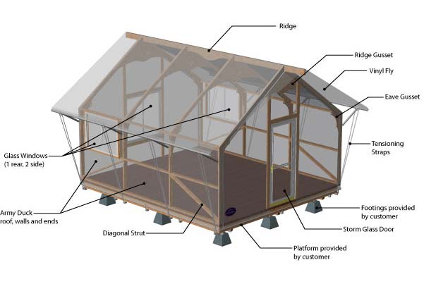 Choose from a variety of 20 size combinations with window and door customizations. Window styles include 42”x30” and 42”x15” mesh fabric with zip up privacy flaps as well as 48”x48” and 36”x48” lockable sliding glass windows. The front and back door options for our cottage include our Safari door flap with built in bug screens with easy zipper access, 36” wood door, solid, half light or full light. Upgrade your cottage to include 48” or 60” full light french doors, depending on your selected width!