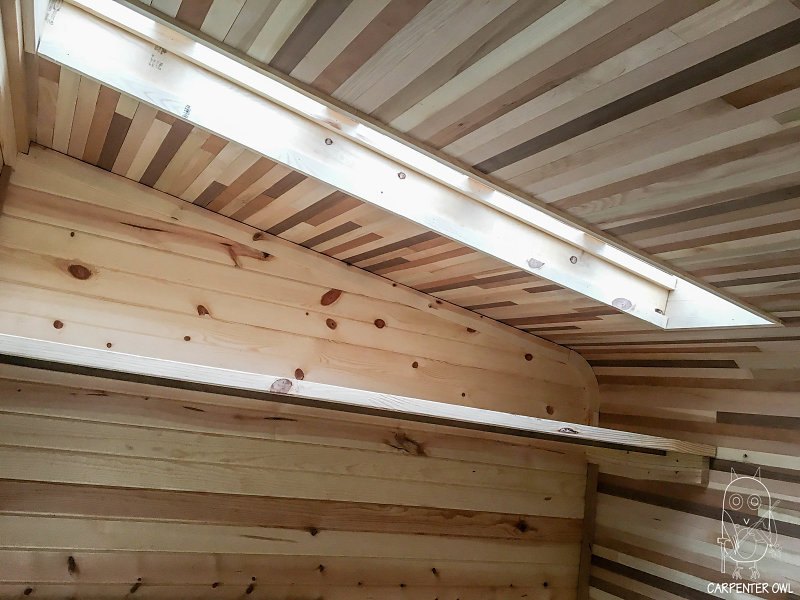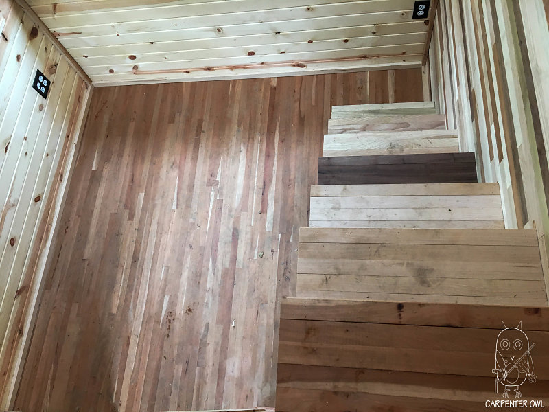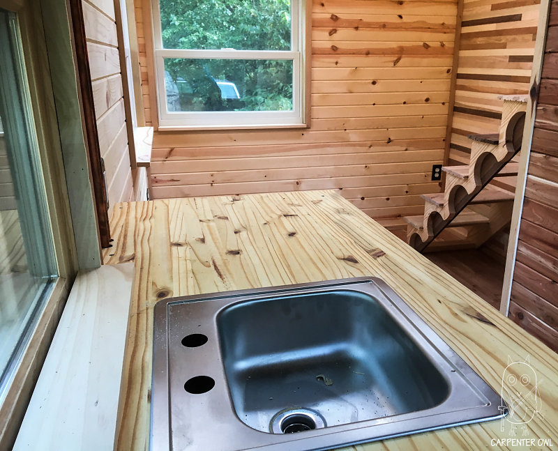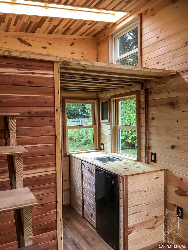 This saltbox style tiny home was built to be a very simple, compact space for one person to live comfortably.