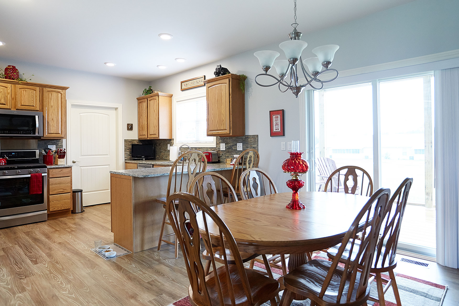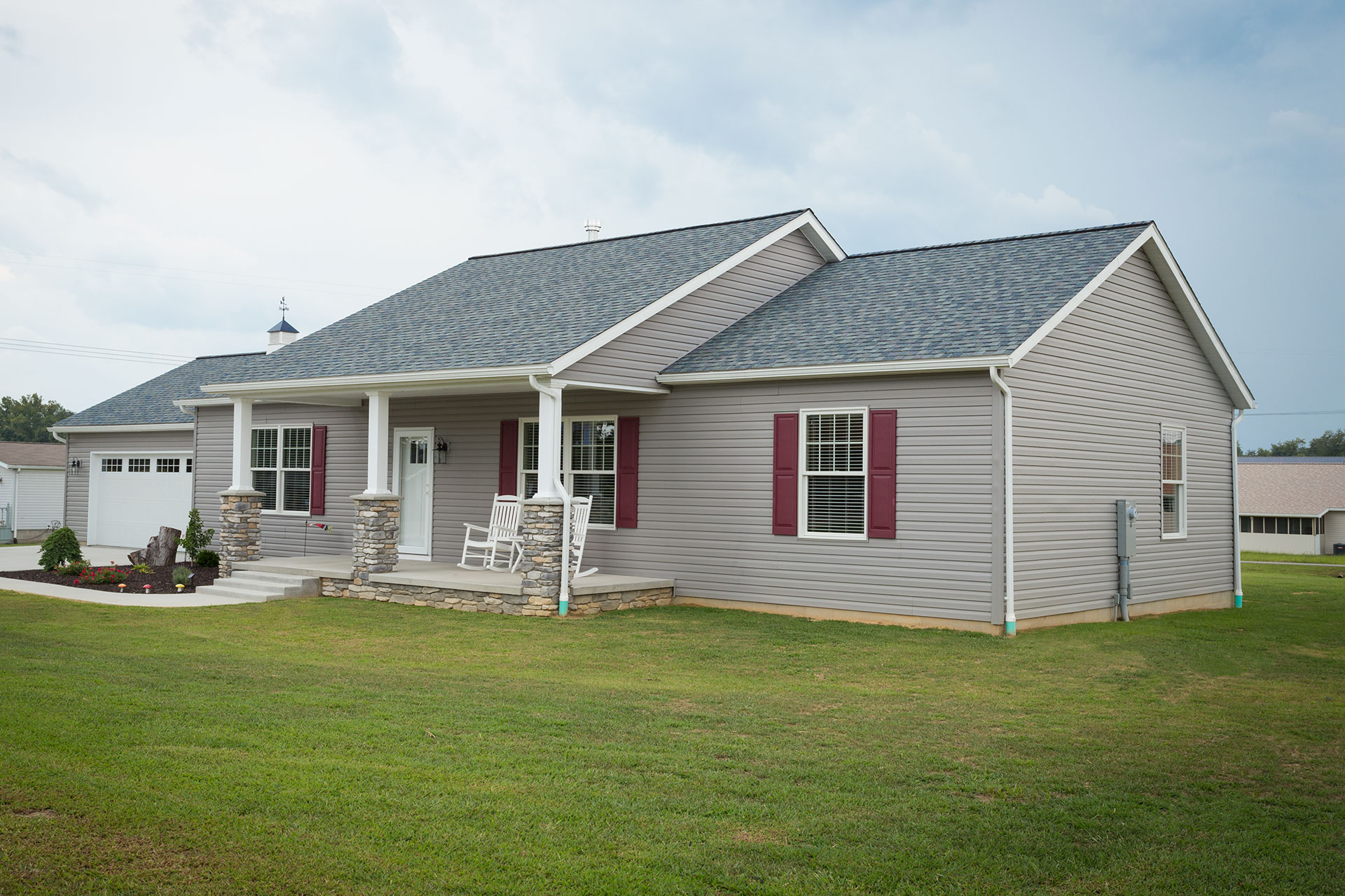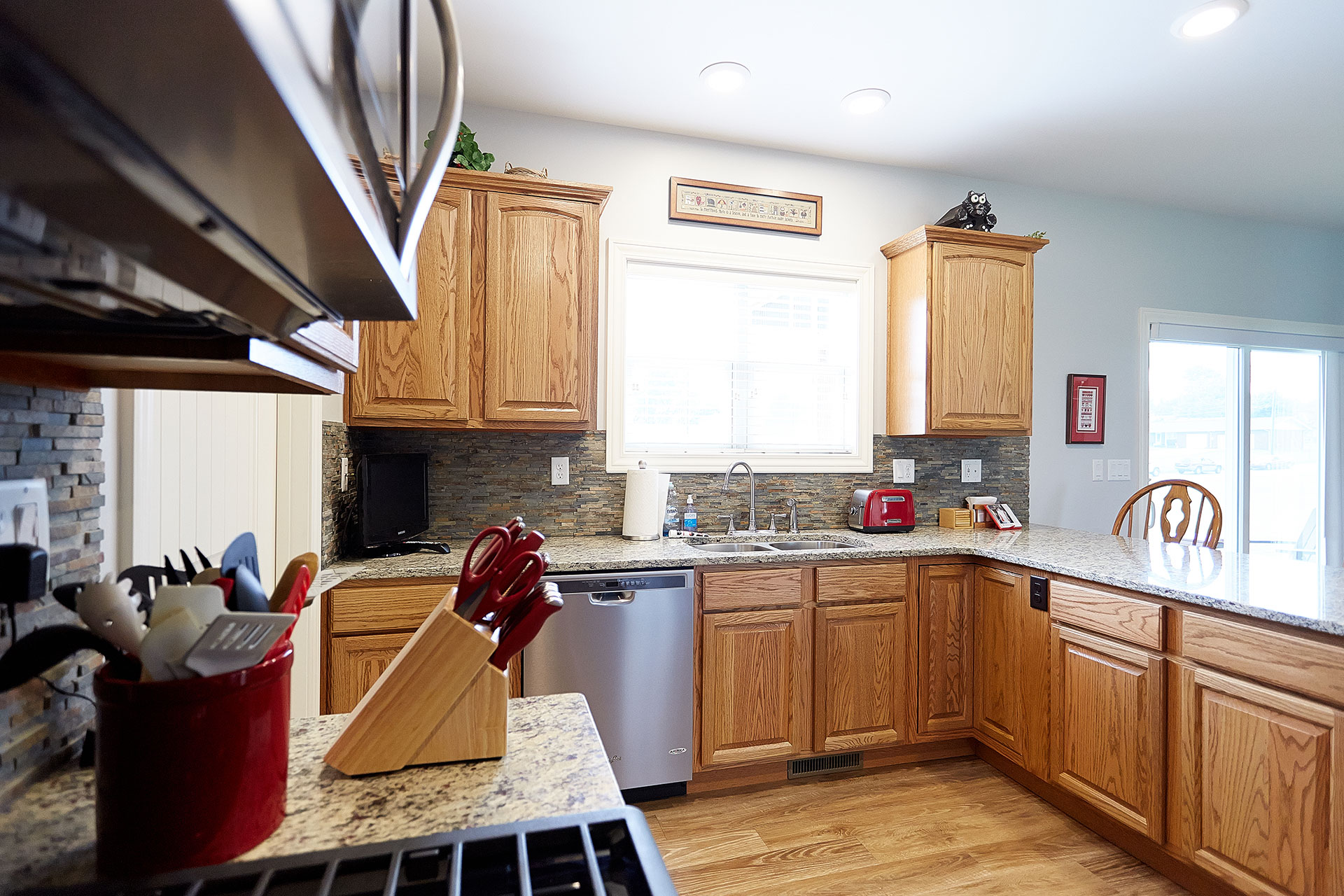 A touch of stone dresses up a façade featuring low-maintenance vinyl siding. The nicely finished kitchen has a gas stove, microwave and granite countertops.