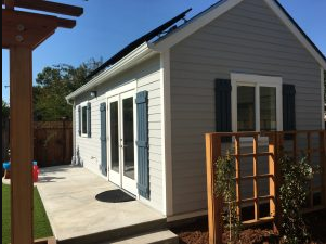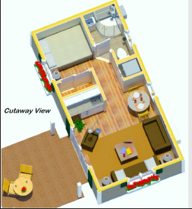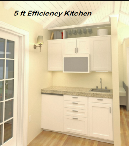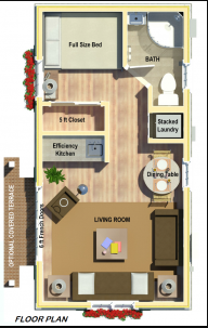 Perfectly sized to fit in almost any backyard, our 300 sf tiny home includes a full size living room, private sleeping area, bath, kitchenette, and dedicated dining area. There’s even space for a stacked washer and dryer. Despite the small size, the floor plan feels airy and spacious with the lofted 12ft wood beam ceiling, large french door, and windows lighting up the entire interior space.