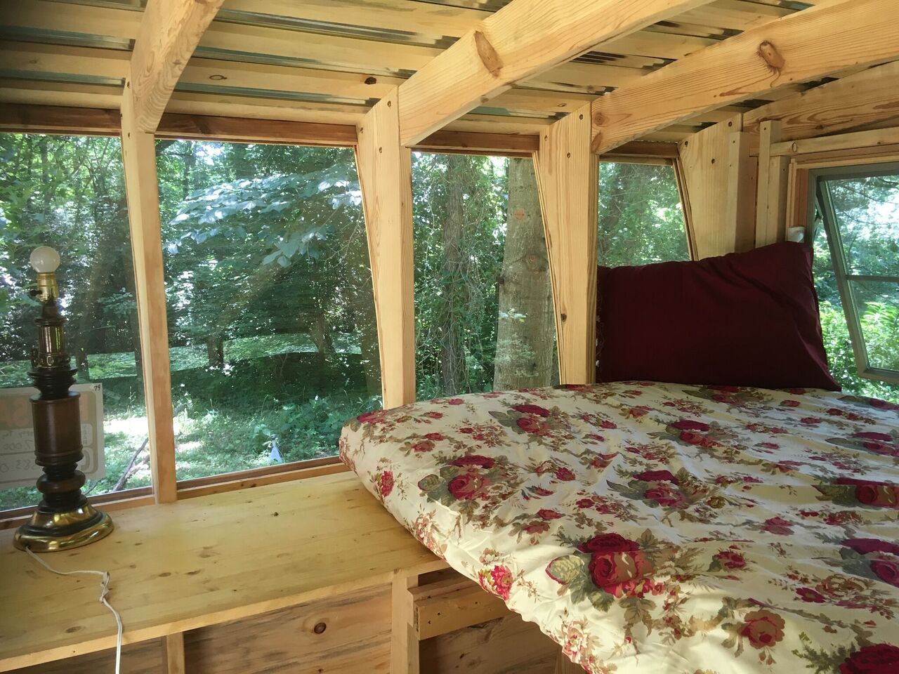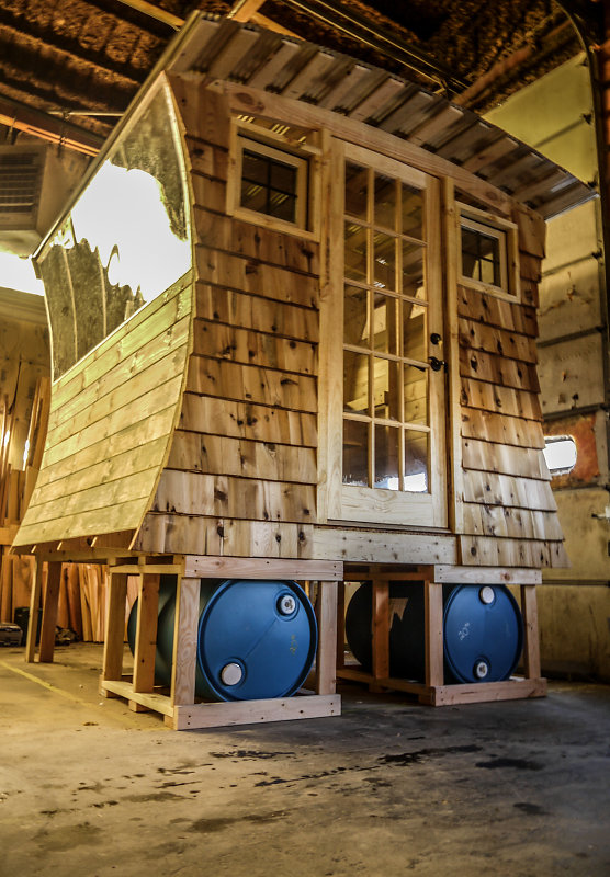 Though this structure now resides on an educational farm it was originally built to be part of the Cafe Junkit collective; a project to take homemade boats down the Mississippi stopping in riverside towns to put on shows and serve pumpkin pie.