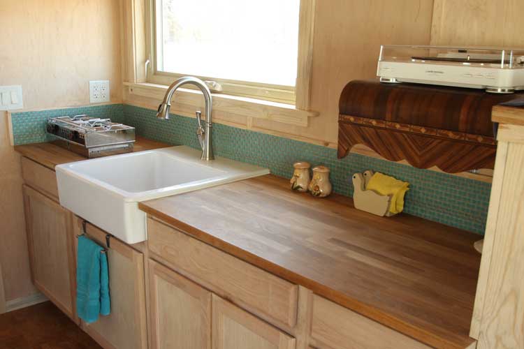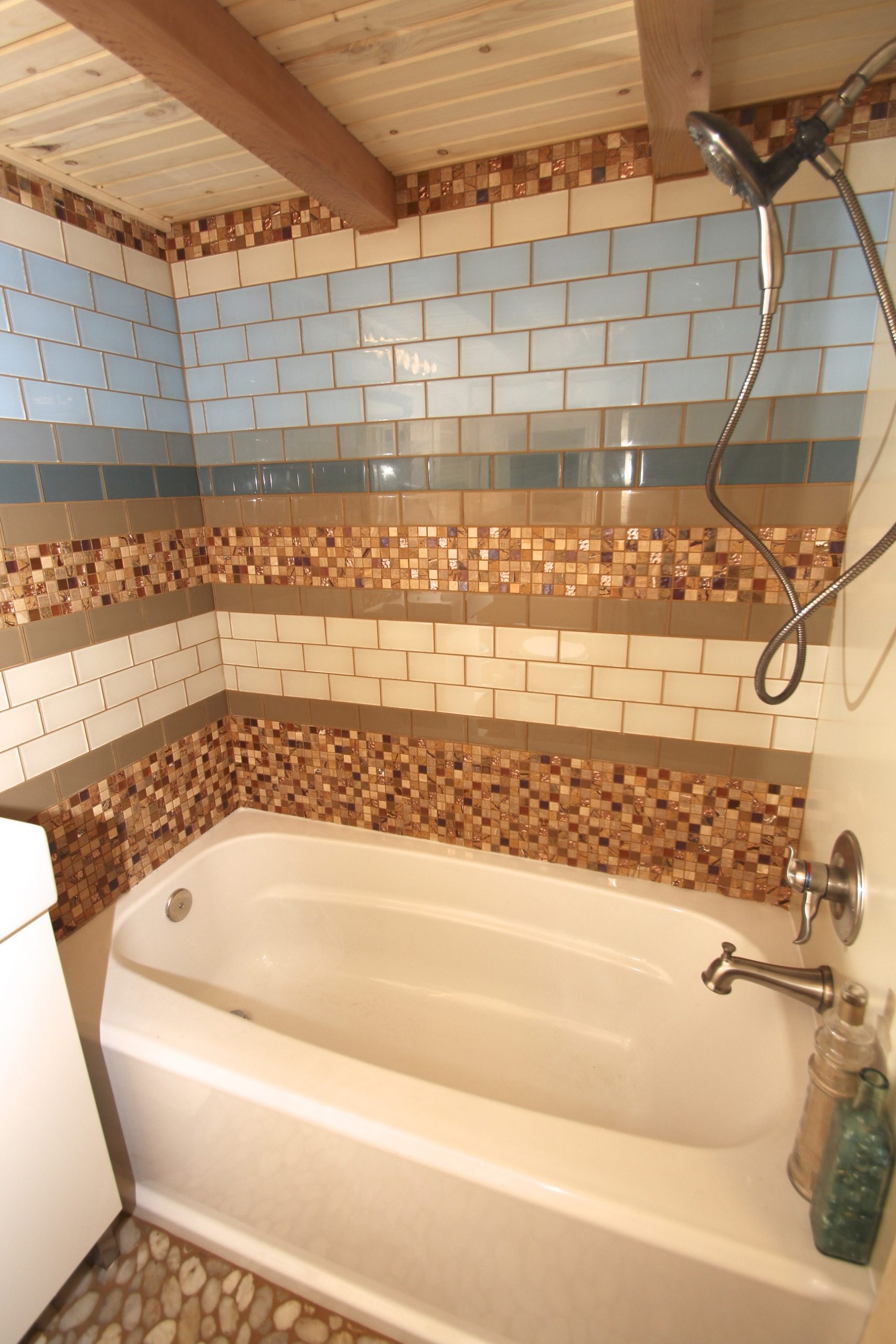 California daydreaming while sitting in snowy Colorado, the future filmmaker wanted a Tiny with an “ocean theme” to warm her soul and future. Thus, the exterior’s lower sides represent the ocean with its blue metal siding. Immediately above the ocean there is sand-colored “Breckenridge” siding for the beach feeling. Placed above the beach are multi-colored blue sky scalloped shingles creating a magical and whimsical appearance to this captivating Tiny.