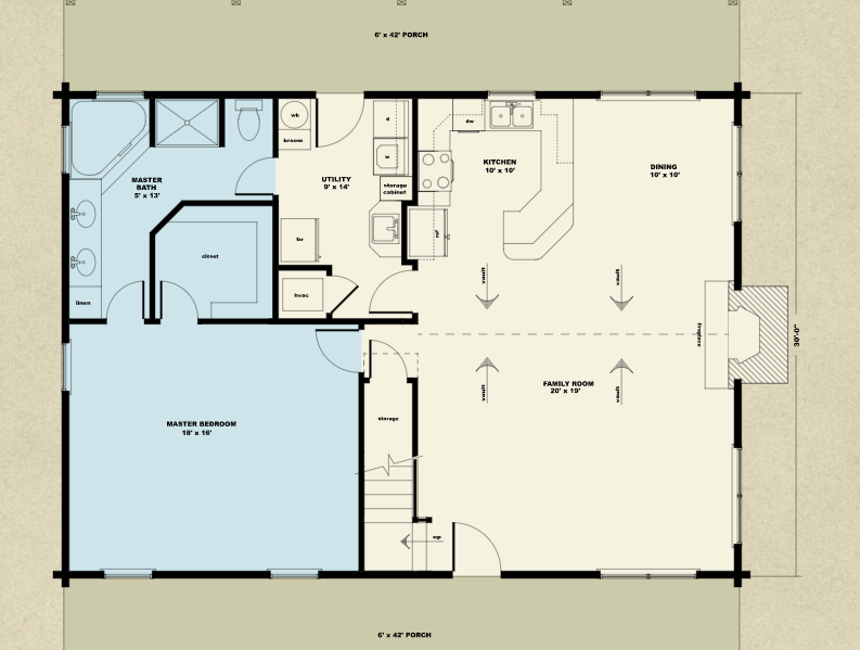 One bedroom designs are not terribly common in the general housing market, but because log homes are frequently built by empty nesters for retirement living, or as 2nd homes at special destinations, they can be ideal for some couples and families. The Kickapoo allocates extra space to the master suite, which becomes the first plan in the Satterwhite range to feature a spa tub in the master bath. Consistent with modern home design, the kitchen, dining, and family rooms are an integrated space, all sharing a lofted ceiling and commanding view of the stone fireplace. The utility room with sink, laundry and space for a freezer round out the main floor. Upstairs, in the lofted design, there is finished space suitable for a variety of purposes from climate controlled storage to a home office.
