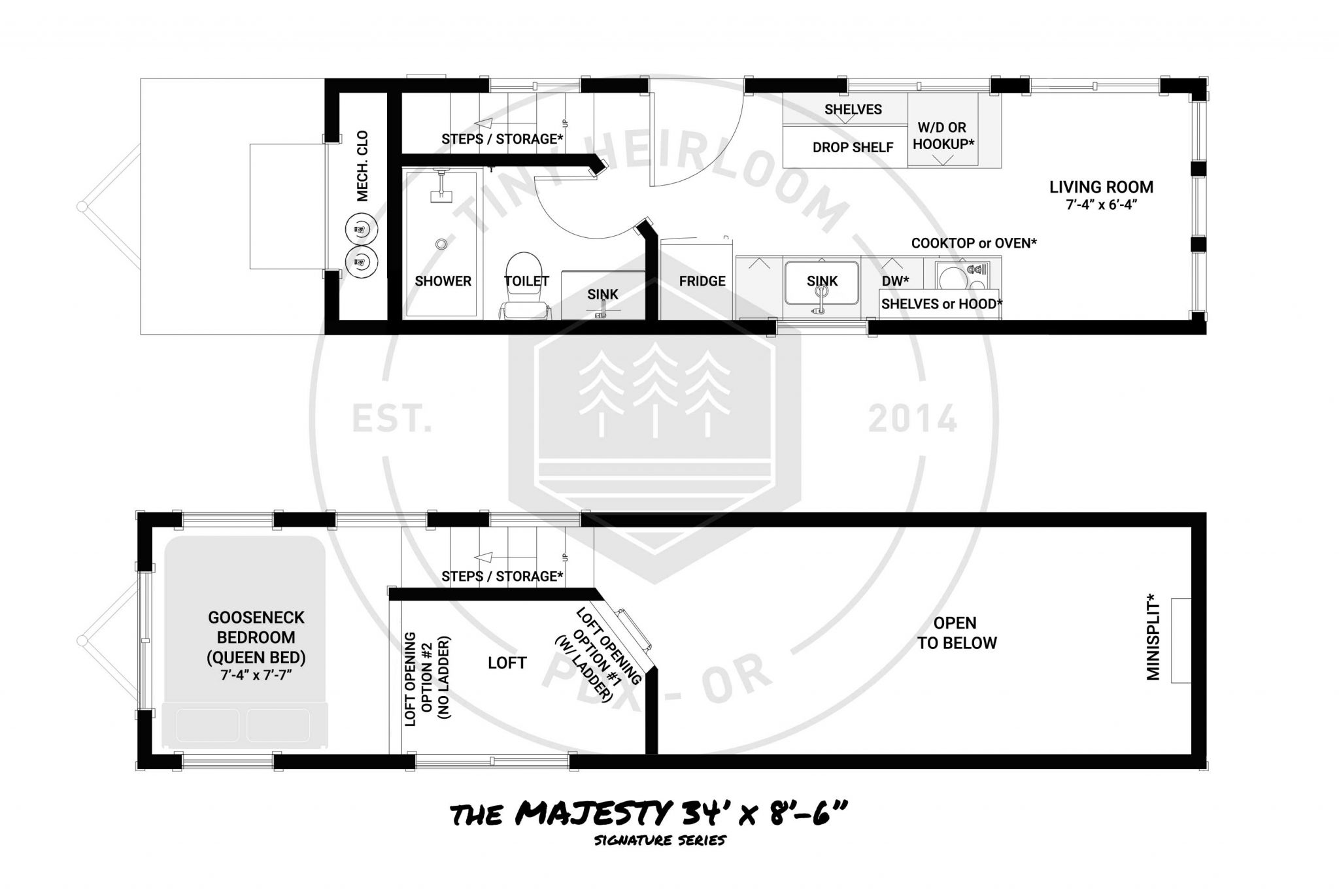 Comfort is Key, as this is the Queen of the fleet! The Majesty was created with the thought of everyone and anyone knowing that not all “Tiny’s” work, this unit surely will. With nearly 272sf, this unit not only comes with a true dedicated master on the main, it has a full-sized closet and/or second living or sleeping area, full sized bathroom, living room, and galley kitchen to host a lifetime of memories. At 34ft long, this unit will truly become your Heirloom to pass onto future generations.