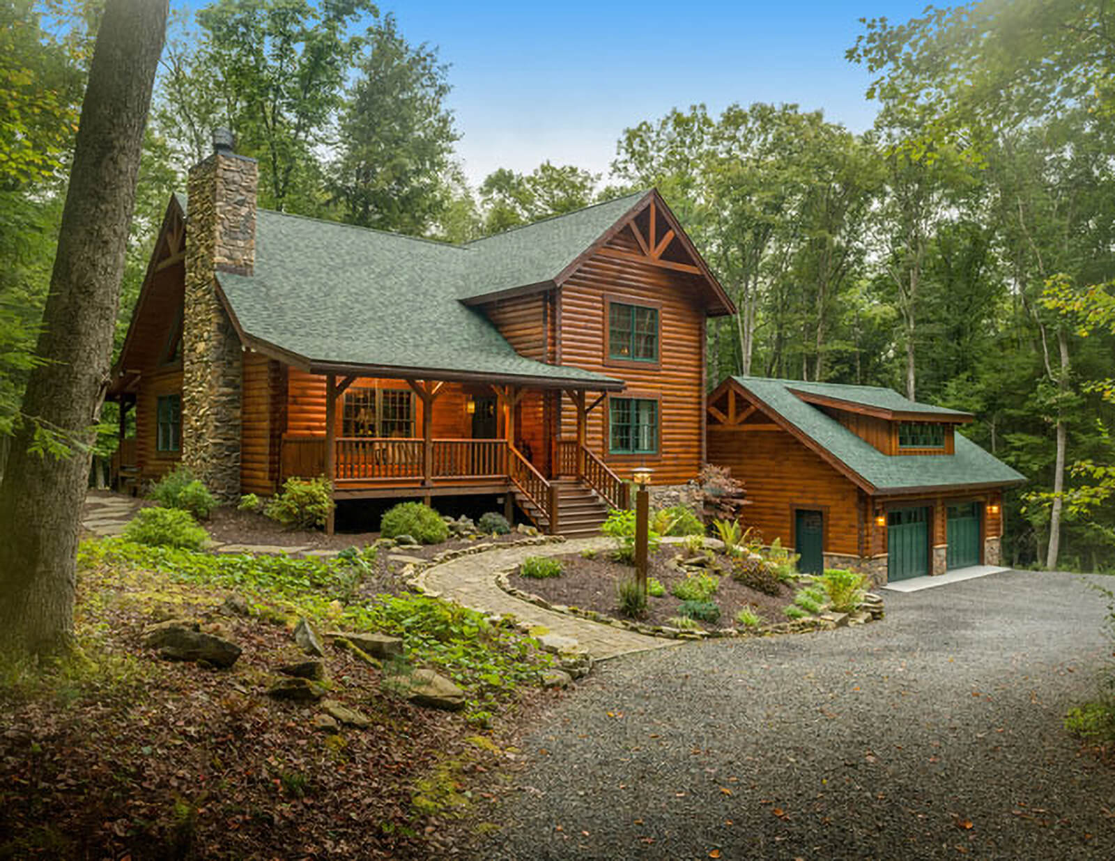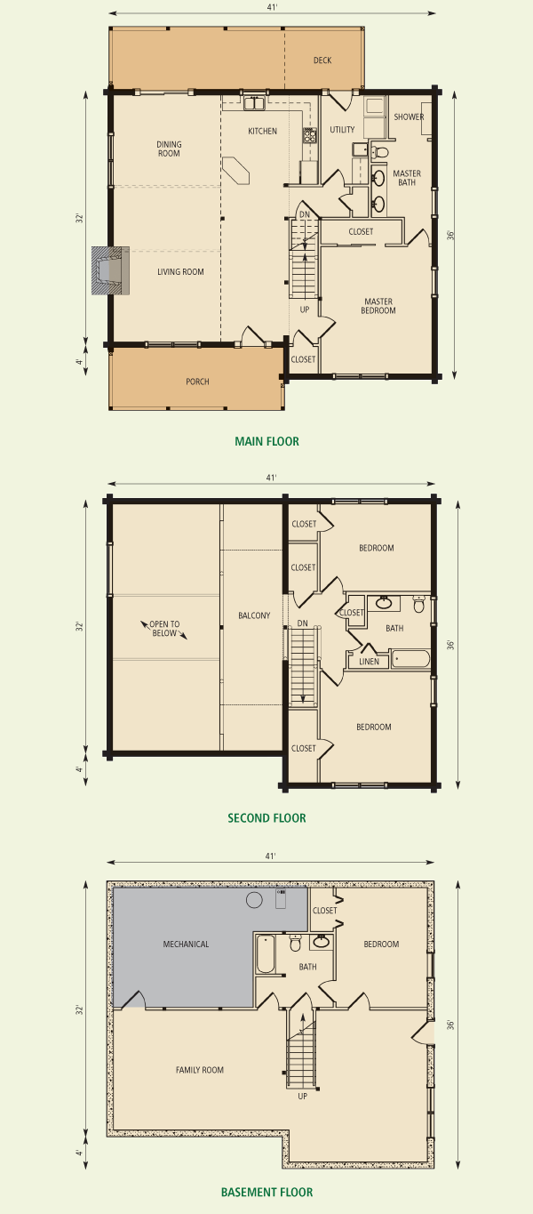 This floor plan was voted one of THE BEST in Log and Timber Homes of the Year Magazine Issue 2020. The Appalachian Double Round log profile and Saddlelok log corners expresses this log home owner’s love of wood in this Custom Oakland log home floor plan. Log home living is realized in this warm and inviting log cabin. Three stories full of love, the main floor is designed for family living in this open floor plan. The main floor is perfect for family gatherings or parties that can be extended to the porches off the dining and living rooms.