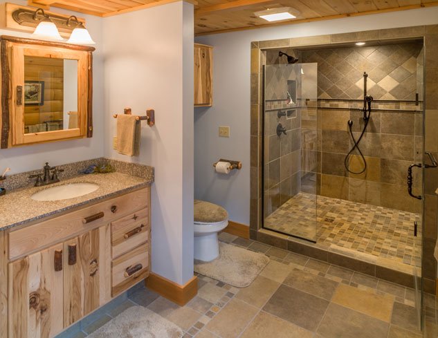 This custom floor plan was designed with family and friends in mind. On the second floor, two bedrooms share a bath and a large balcony overlooks the main floor living area. A big bonus in this floor plan is the basement floor—home to the family room where kids can get away from adults or vice versa. Also on the lower floor, a bedroom is adjacent to the family room and next to a full bath. Mechanical equipment has a defined space in this unique log home. Beside the main house is a beautiful, detached 2-car log garage covered with matching log siding and corners adding even more distinction to this custom rustic design