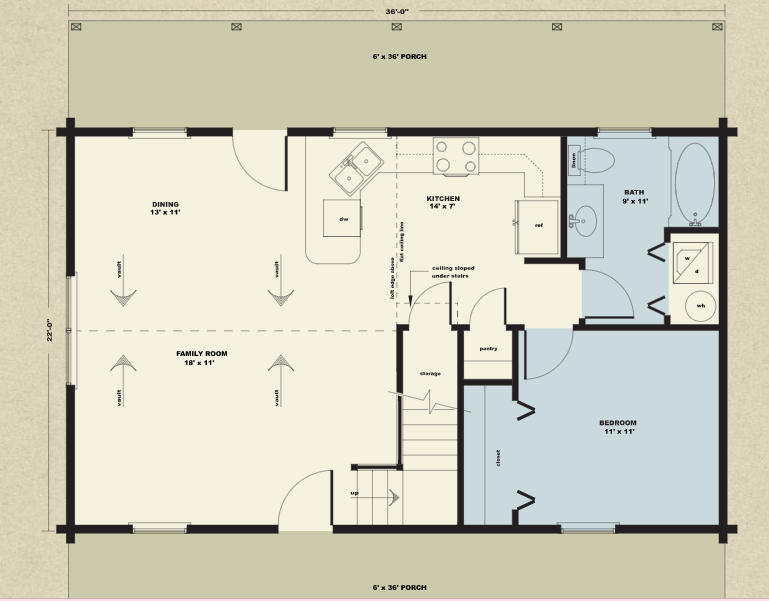 The main level of Porter’s Landing contains all the essentials: bedroom, bath, kitchen, dining, and family room. Closet, storage, and pantry add livability to this floor plan, and the loft space is a real bonus. At 986 sq ft of living area, this plan delivers the log home lifestyle in an inviting, open design that connects the kitchen with a dining area and living room enhanced with a vaulted ceiling.