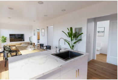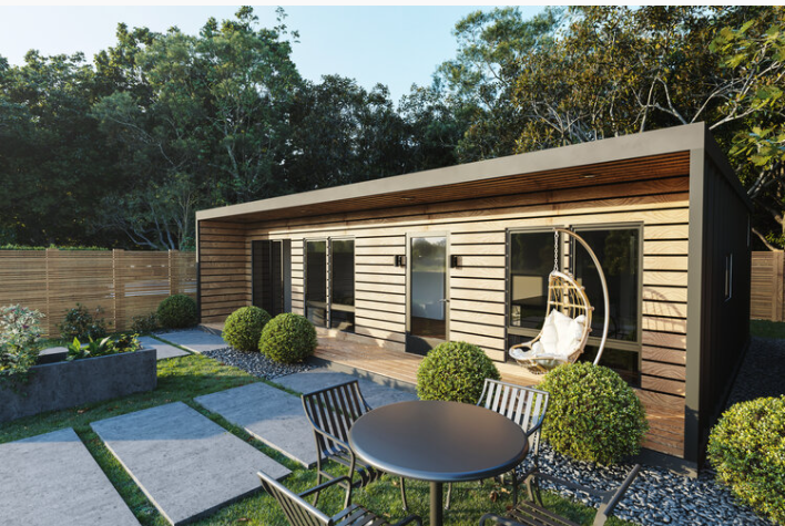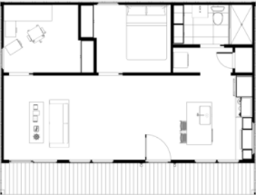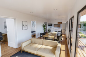 Our largest ADU model is a provides modern ample living space for a small family — complete with 2 bedrooms, 1 bathroom, separate laundry and a generous open floor plan for kitchen, dining, and living room spaces.