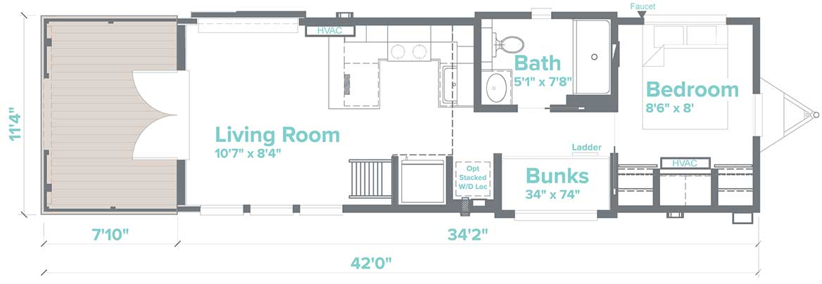 The Alexander Park Model is perfect for your next family vacation or weekend adventure. With room for eight, you won’t have to worry about leaving your four-legged friends behind. The Alexander’s thoughtful, farmhouse design features built-in closets, bunk beds and a wide storage ladder leading into the spacious sleeping loft.