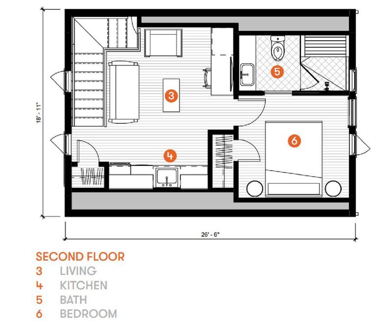 Featuring a 1 bedroom ADU over a garage, this efficiently designed space provides the perfect guest suite or income property, without sacrificing off-street parking. The Clayton is optimized for 25′ wide lots, providing private access to the ADU, without an exposed exterior stair. Vaulted ceilings bring impressive volume to the interior, with optional skylights offering ample daylight into the shared kitchenette/living area. Designed to provide room for a desk below a wall mounted TV or screen, working from home has never been easier. The bedroom features the same vaulted ceilings and a closet to supplement the coat closet at the top of the stairs. A creatively laid out bathroom provides a glass surround shower with a bench, and a generous vanity.