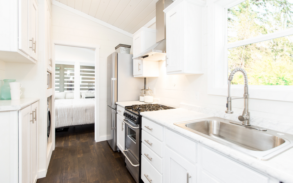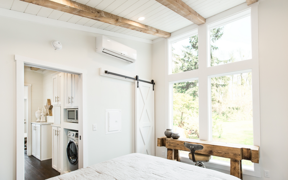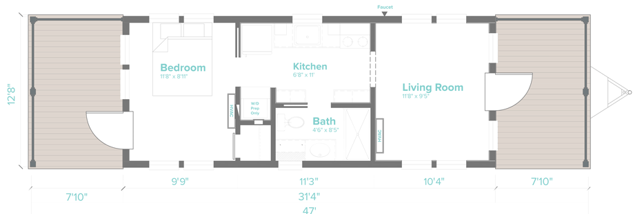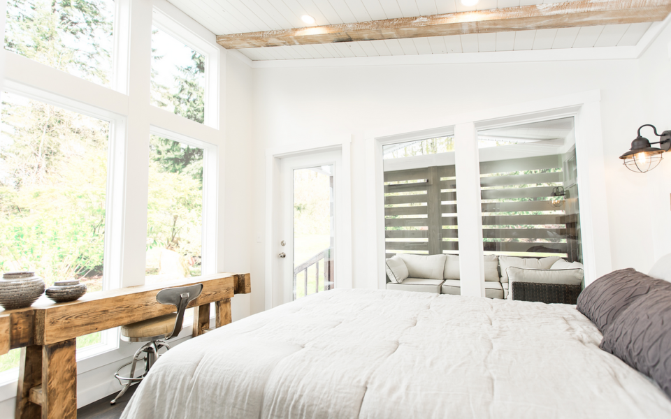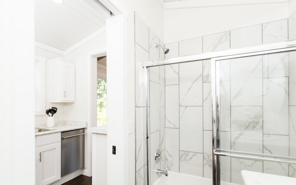 The bright and airy Collins Park Model is a stylish hideaway perfect for any modern family of four. The exposed beams, quartz countertops and king-sized master suite shine in the abundance of natural light. While this model’s front porch invites more sunshine, the rear porch has been screened in to create a more private setting.