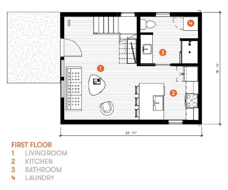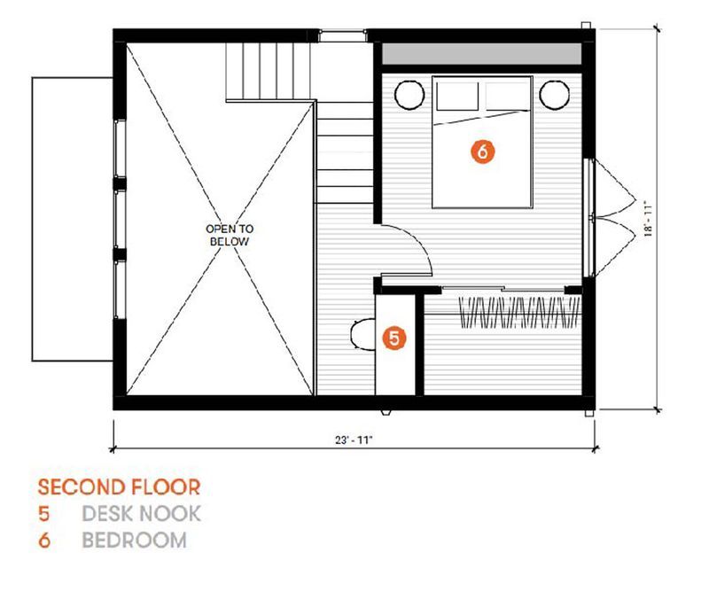 The Laneway Cottage is an Accessory Dwelling Unit which draws inspiration from alley-accessed homes found in Vancouver, B.C. A vaulted living space with massive windows maximize the daylight pouring into the living space, facing the eat-in kitchen beyond. The bathroom is generously sized, and includes a niche for a stackable laundry unit. Upstairs, a built-in desk looks over the living space below. The bedroom features vaulted ceilings, and a large closet. The exterior patio provides a cozy outdoor space, which can double as surface parking, accessed from the alley.