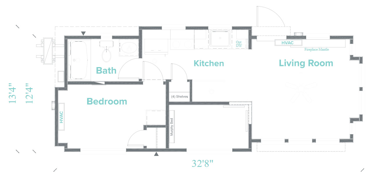 The Oakley Park Model was design with both functionality and style in mind. The large living room can accommodate two 72” sofas to seat family and friends, while the flex room has a convenient Murphy Bed to allow for a separate dining area, yoga retreat, and the option to sleep an extra guest. Glass barn doors allow for an abundance of natural light while maintaining privacy. Loft space is equipped with steel stairs and will accommodate two queen mattresses and one twin mattress.