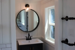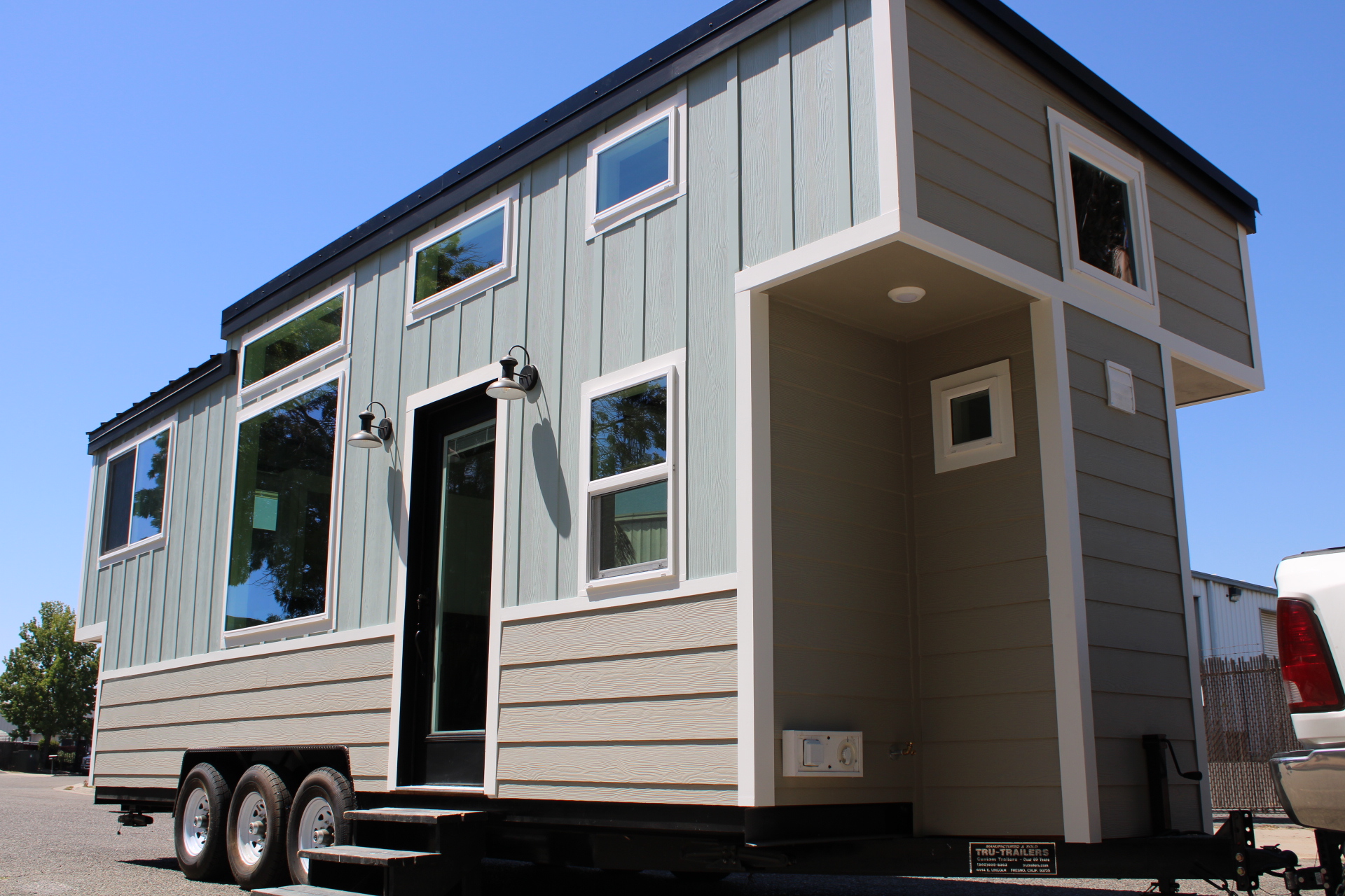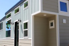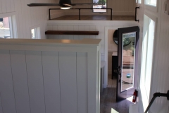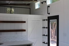 Windows, windows, windows. This tiny house is only 26′ long and 10′ wide but offers lots of natural light! The Orchard is another KJE tiny house built as an AirBnB. The modern design with wood accents provides a perfect combination. This tiny house features a standing height bedroom, loft, living room with accent wall, storage under the bedroom platform, farmhouse sink, 2 burner cooktop, space for a mini fridge under the counter, and a spacious bathroom.