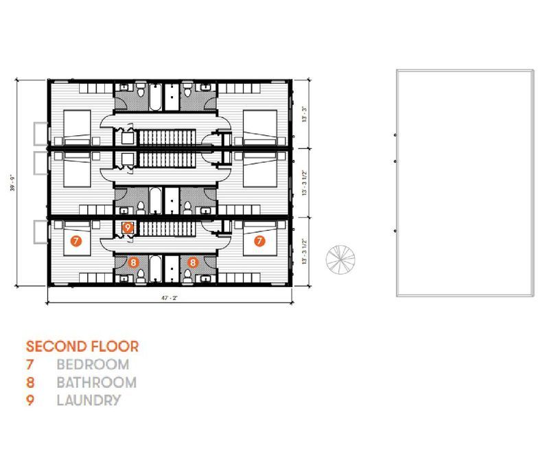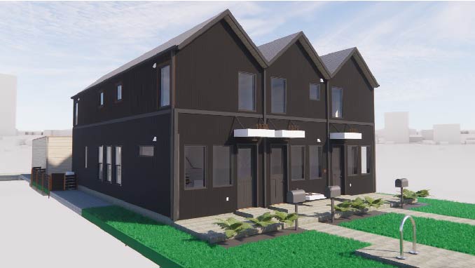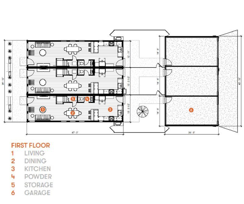 Perfectly suited for 50′ wide lots at an approachable price point, The Sloan Triplex provides 3 efficient units, each with backyards, and private off-street garages. The open concept living, dining, and kitchen offer generous cabinet storage and an eat-in peninsula, while a powder room below the stair maximizes the functionality of the main level. With generous windows at both ends, the kitchen leads out to a cozy backyard oasis, and access to a private garage each with room for storage. Perfect for a small family, or a pair of renters seeking more space, the second level features vaulted ceilings in each bedroom with efficient built-in closets, two en suite bathrooms, and a laundry closet.