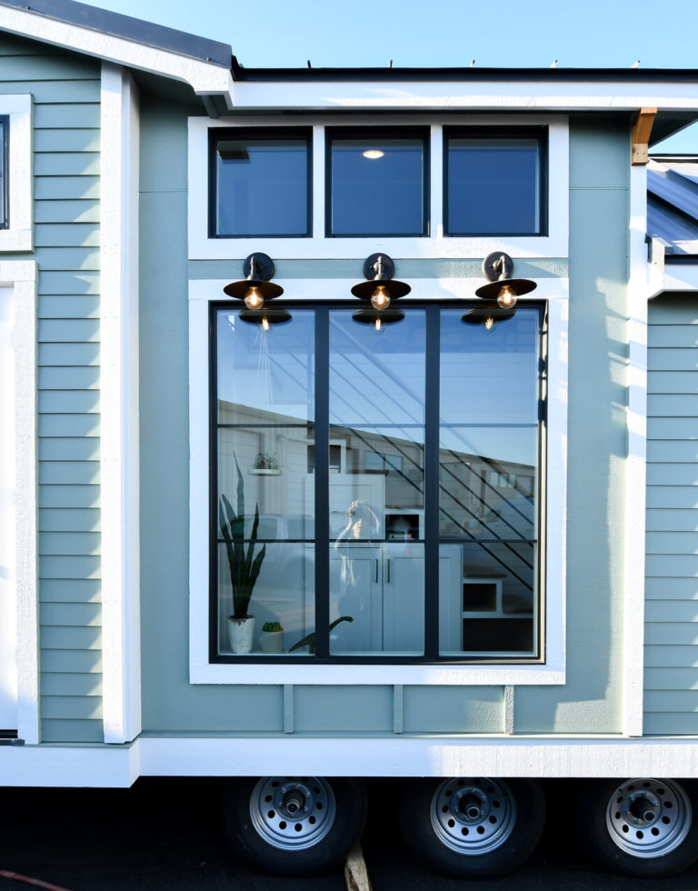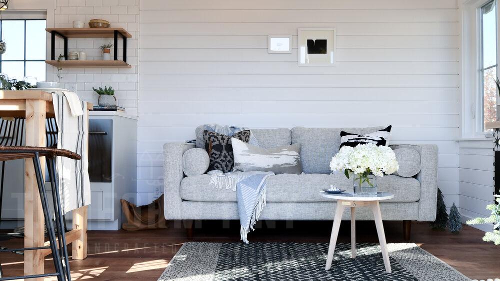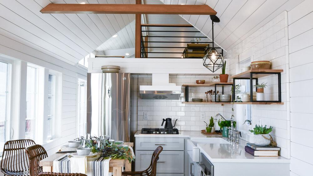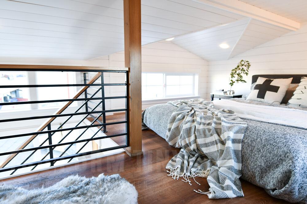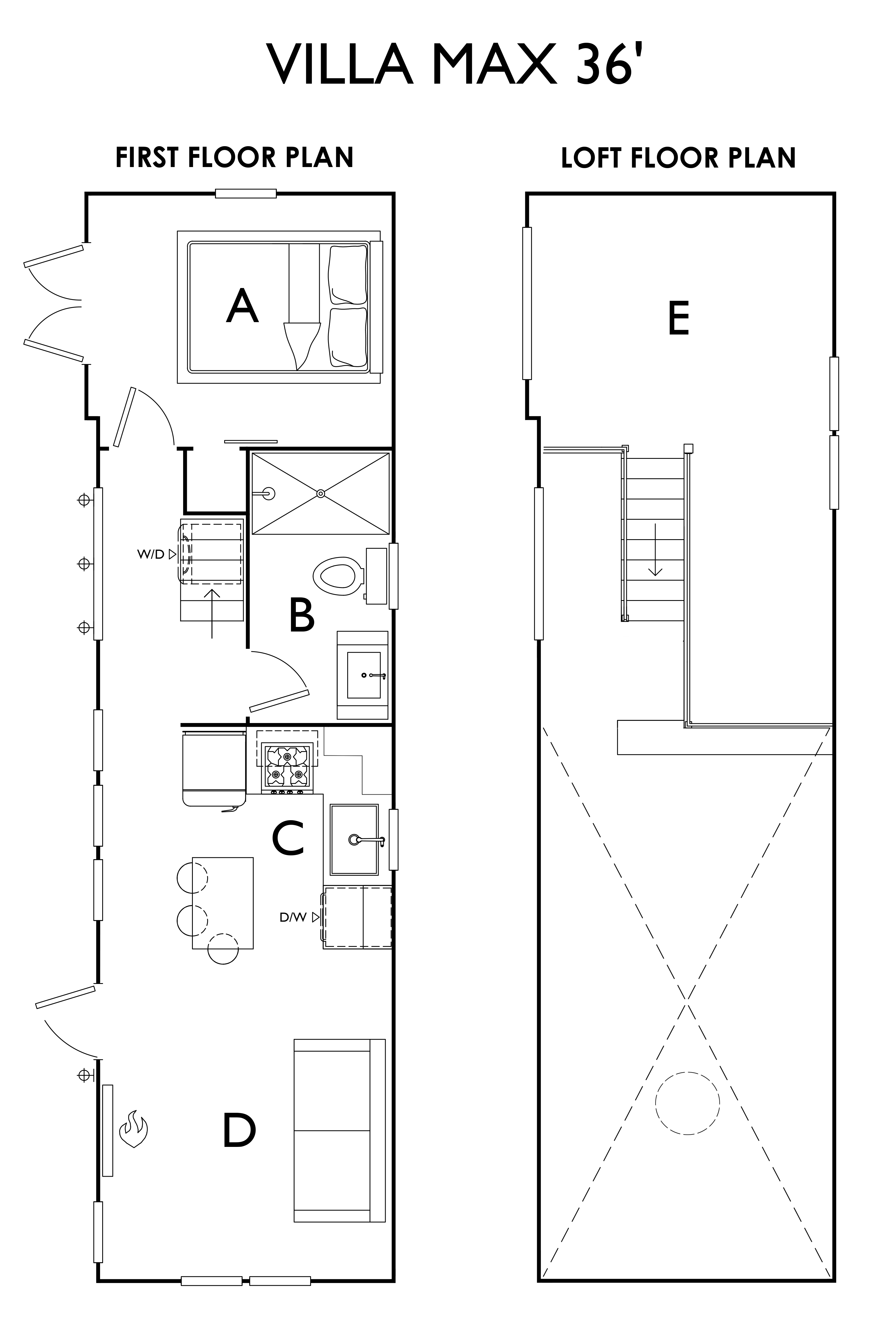 The Villa Max is a 10ft wide park model in our farmhouse modern style (480 sq ft.) This model has a very large loft, a bedroom downstairs, a 4.5 ft x 8 ft bathroom, a large kitchen with apartment size refrigerator, 3 burner furrion built-in range, 24 inch apron front sink, optional dishwasher, positionable island/dining table, and hood vent. for 2021 we have added upper cabinets to the kitchen wall outside the bathroom. You still get open shelves to the right of the sink. Outside of the bathroom is storage stairs with drawers and cabinets – this is where we would put your W/D. The stairs can hold an optional venting Washer/Drier combo unit. Additionally, we are offering an optional closet bump-out on the bedroom. Tru Form offers several built in bed options including hydraulic lift and storage beds, elevator beds with headboard desk, and a murphy bed with desk that folds out when the bed is stowed. We offer several heating options including mini split heat pumps (also cools), electric heat, LP furnaces, wood stoves, electric fireplaces, and more.