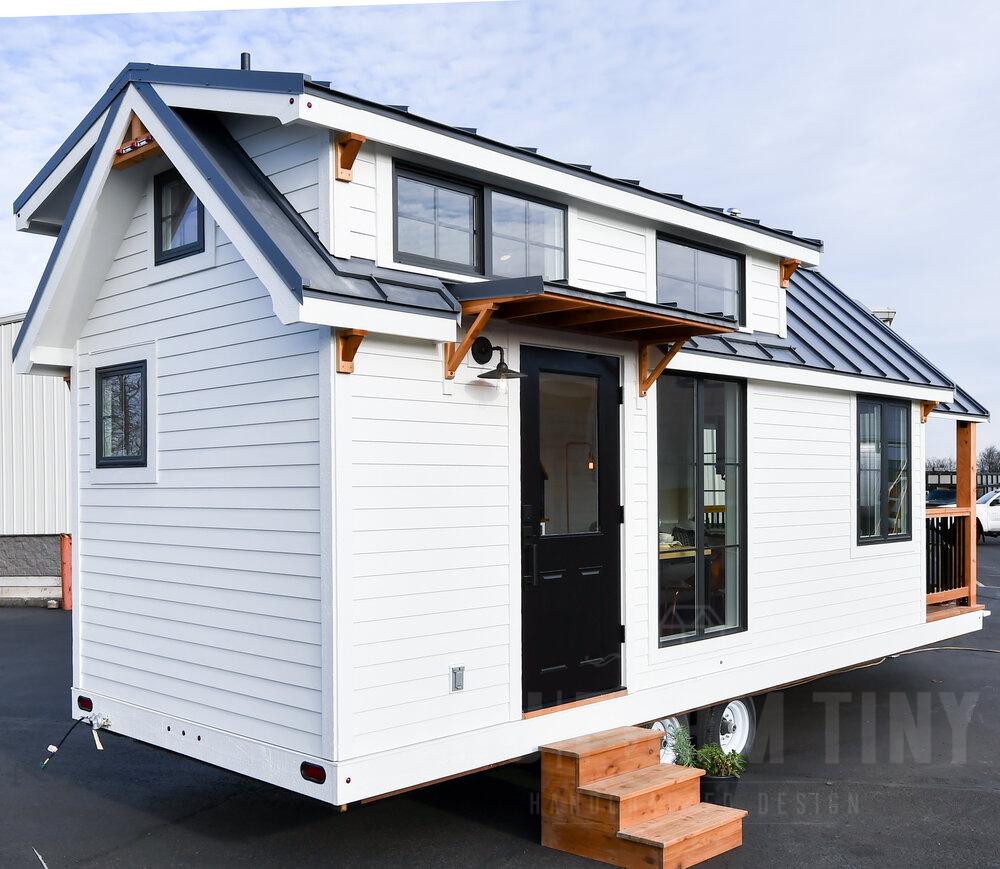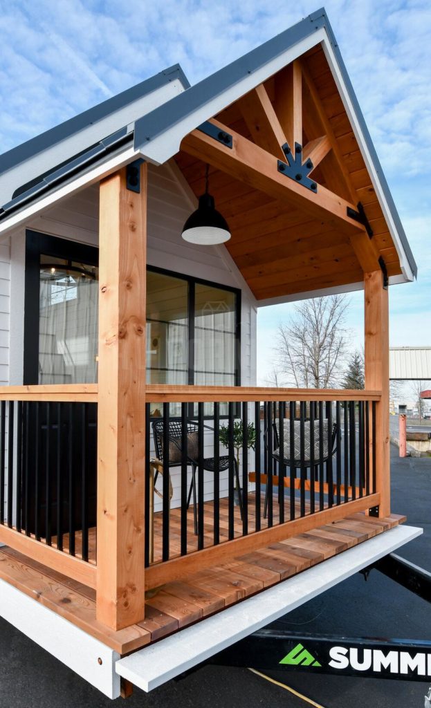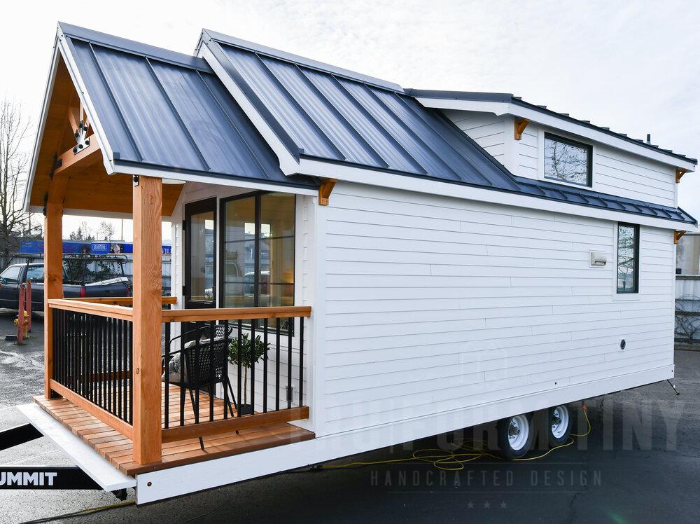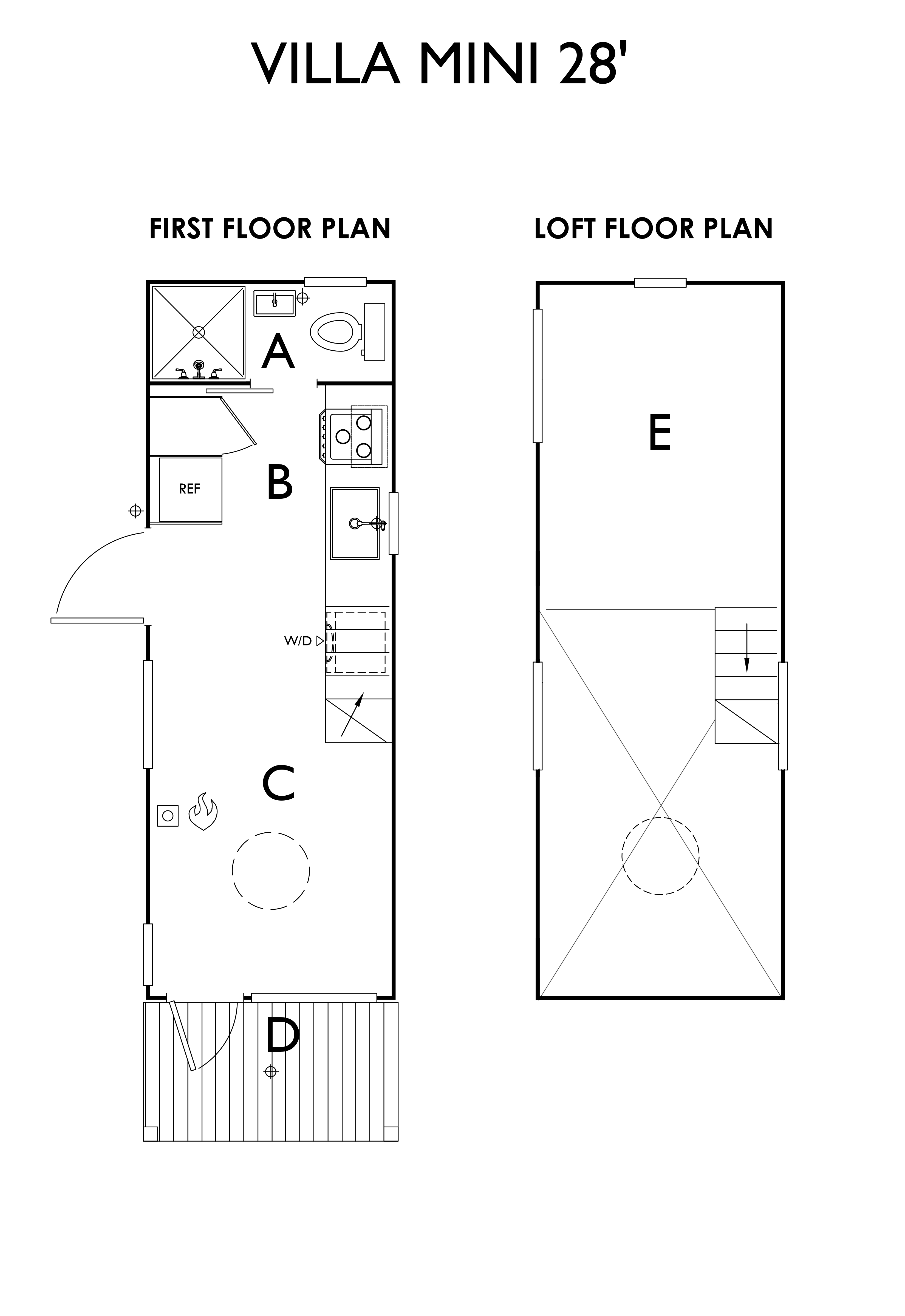 The Villa Mini is the smallest of this series. It can be built as a park model or as a traditional travel trailer with Villa charm. It has 8 1/2 ft x 24 ft of dried in space, with an optional 4 ft deep private porch (D). The porch can be opened for access off the deck. The loft (E) is approximately 85 sq ft, making the interior living space 290 sq ft. It has a 32 inch x 8.5 ft bathroom (A), a galley kitchen (B) with apartment size refrigerator, 3 burner Furrion built-in range, 24 inch apron farm sink, dining table, and hood vent. At the end of the kitchen are storage stairs with cabinets and drawers. A tall closet is just outside the bathroom. The stairs can hold an optional venting Washer/Drier combo unit. Tru Form offers several built-in bed options including hydraulic lift and storage beds, elevator beds with headboard desk, and a murphy bed with desk that folds out when the bed is stowed (located at C – approx. 80′ sq). We offer several heating options including mini split heat pumps (also cools), electric heat, LP furnaces, wood stoves, electric fireplaces, and more.