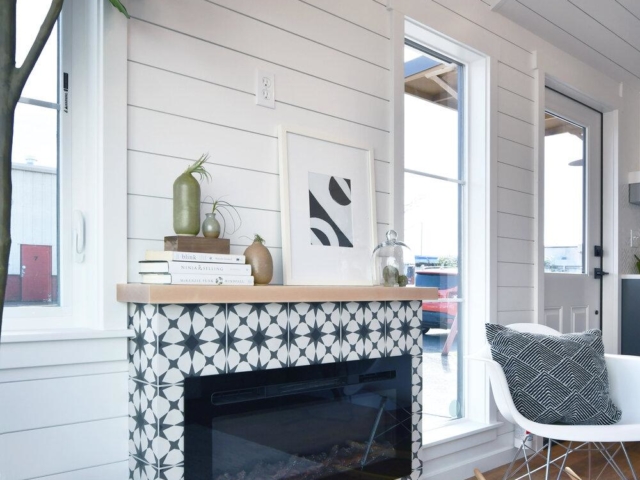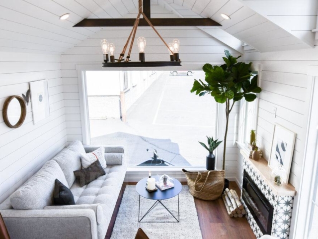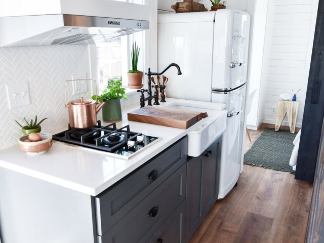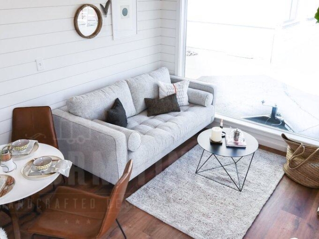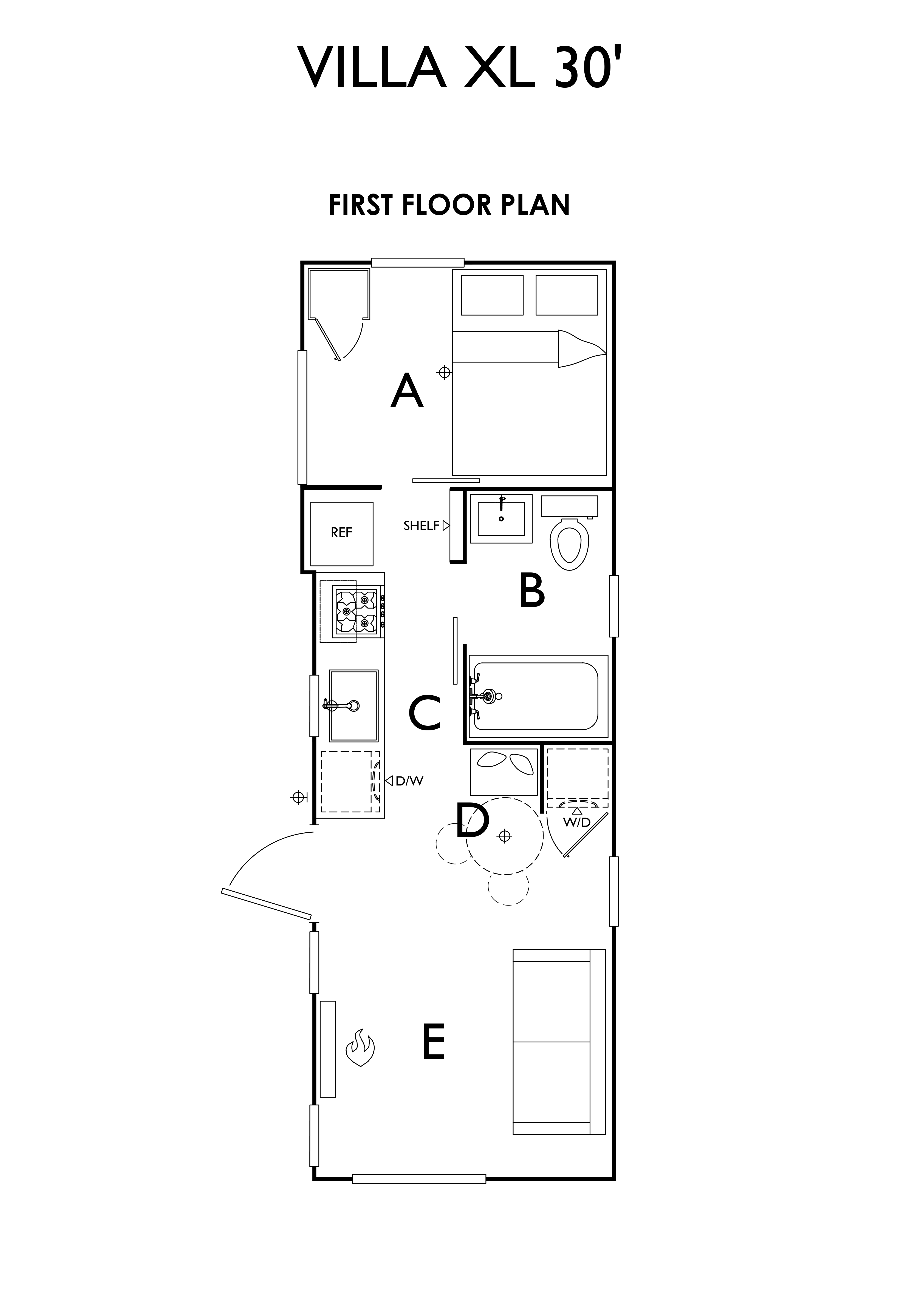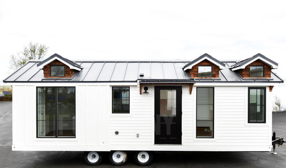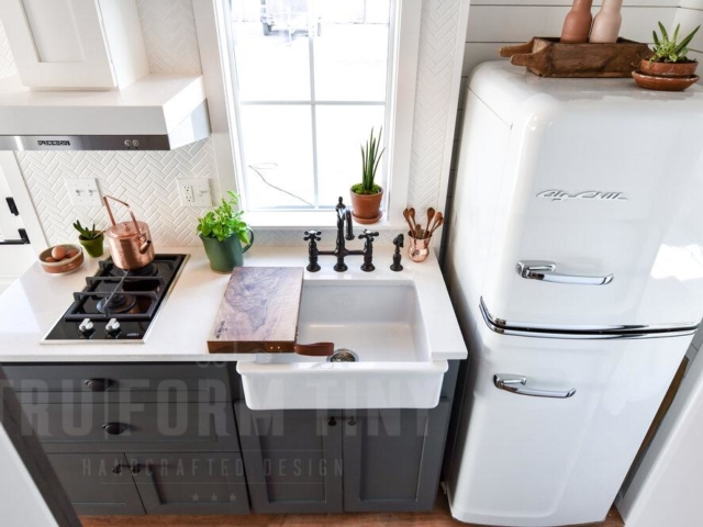 The Villa XL is a 10ft wide park model in our farmhouse modern style (305 sq ft.) This model is all one level with a bedroom downstairs, a 4.5 ft x 8 ft bathroom, a galley kitchen with apartment size refrigerator, 3 burner furrion built-in range, 24 inch apron front sink, optional dishwasher, and hood vent. Outside of the bathroom is a storage bench with drawers and a tall closet that can hold an optional venting Washer/Drier combo unit. The bedroom comes with a tall closet. Tru Form offers several built in bed options including hydraulic lift and storage beds, elevator beds with headboard desk, and a murphy bed with desk that folds out when the bed is stowed. We offer several heating options including mini split heat pumps (also cools), electric heat, LP furnaces, wood stoves, electric fireplaces, and more.