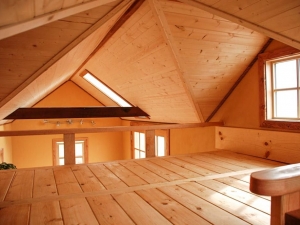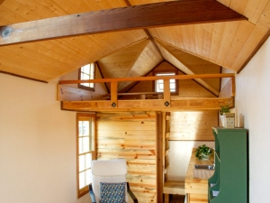 The gable roof with double dormers creates a wonderful pattern in the wood ceiling over the loft, and more than doubles the headroom of the typical tiny house.